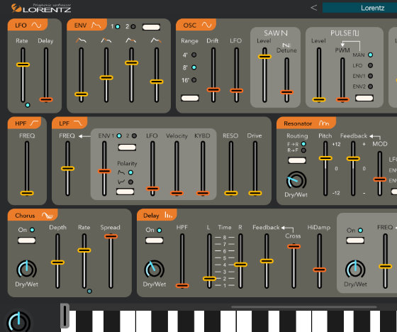 Lorentz is a resonator-based, AUv3-compatible analog modeling synthesizer that can create metallic and distorted sounds.