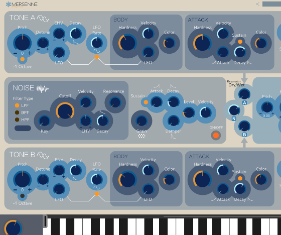 Mersenne is an AUv3-compatible synthesizer that combines two FM synthesis modules, a noise generator, and a resonator to create bell-like sounds.