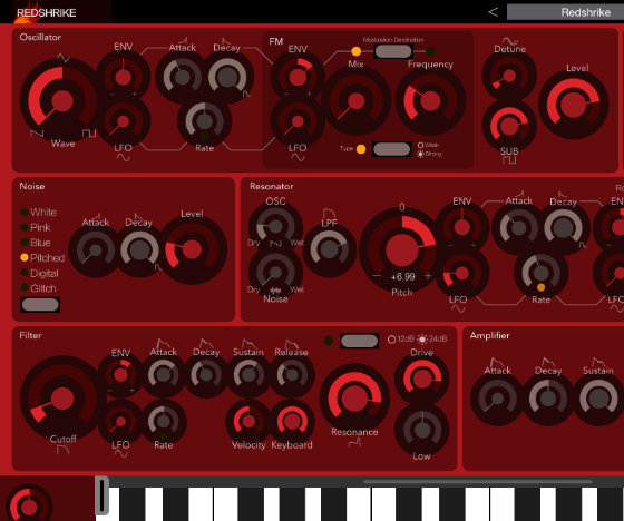Redshrike is an AUv3-compatible synthesizer that combines a resonator designed for more complex sound creation and subtractive synthesis with an FM oscillator that creates distortion.