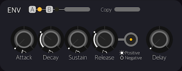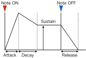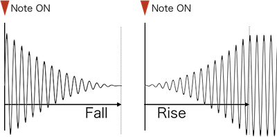 At the timing of the second note on, the Envelope enters the Attack phase, retaining its current value.