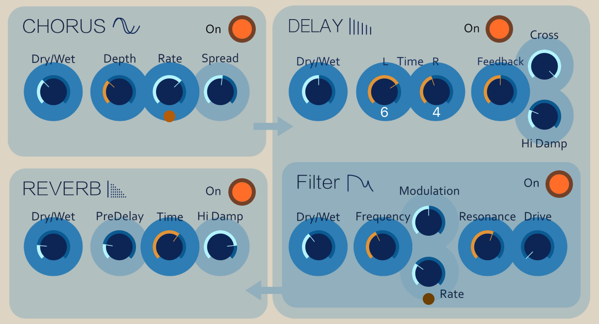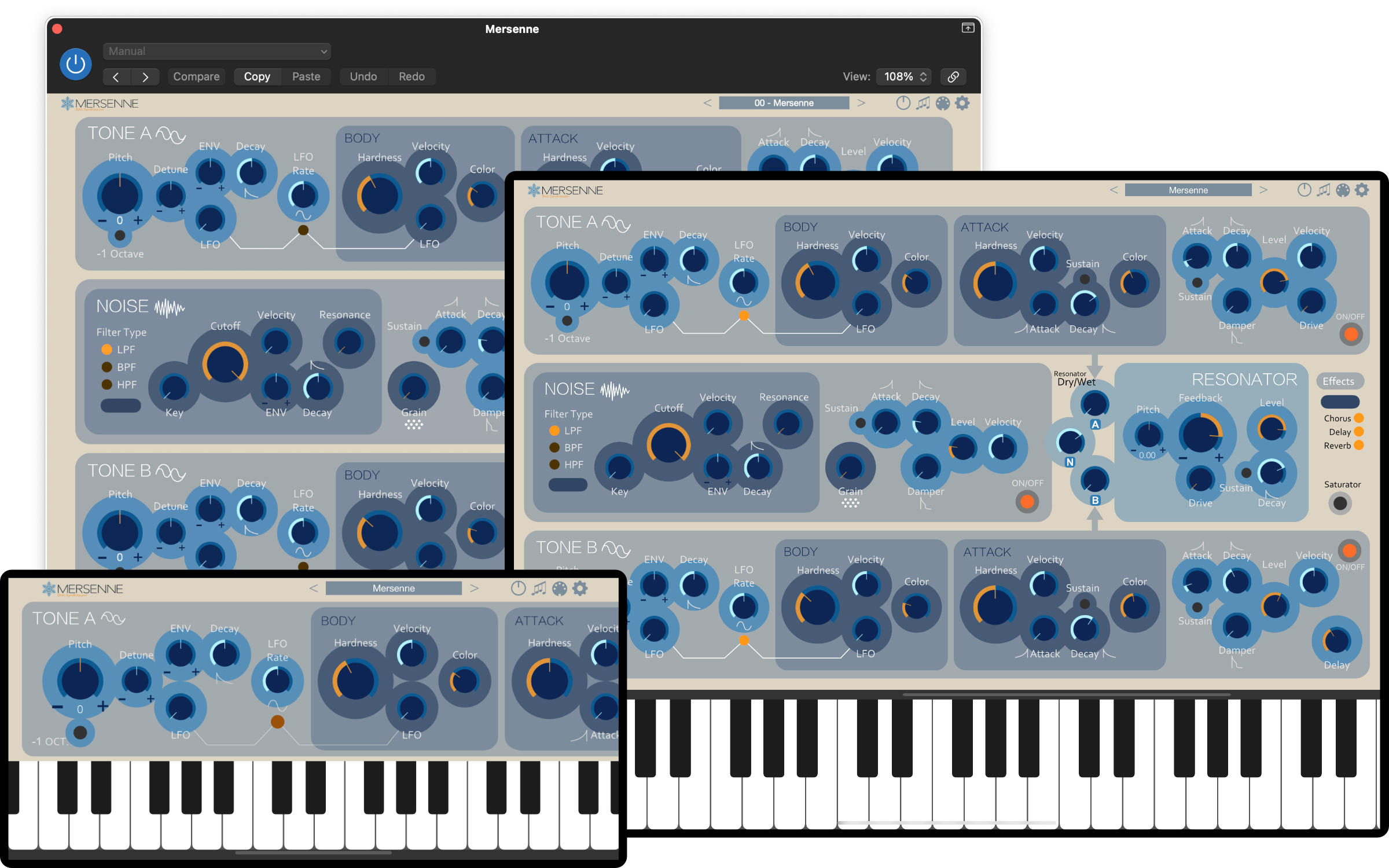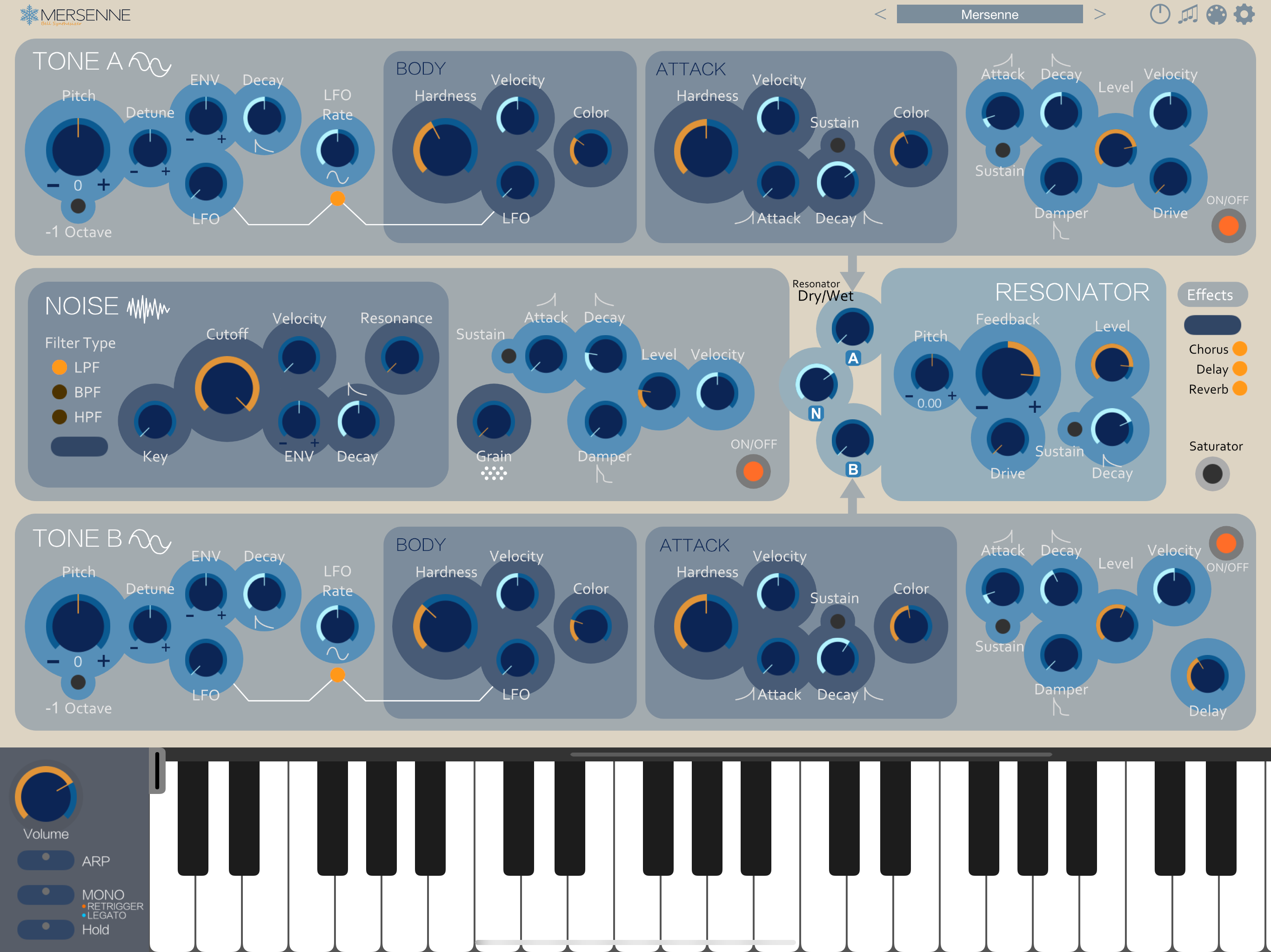Mersenne is a polyphonic synthesizer incorporating frequency modulation, noise, resonator and effects.