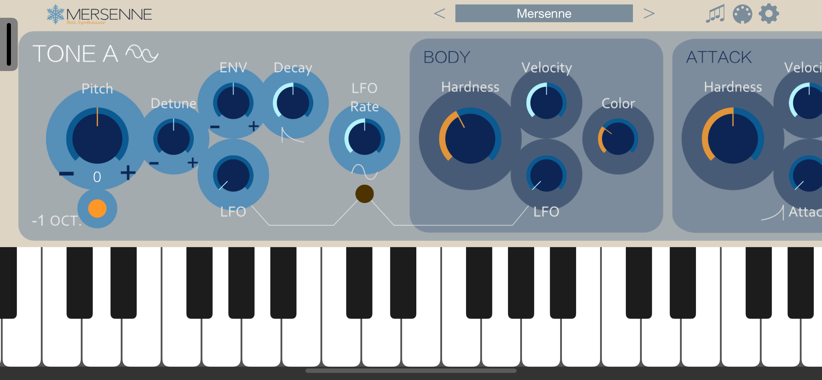 Mersenne is an AUv3-compatible synthesizer that combines two FM synthesis modules, a noise generator, and a resonator to create bell-like sounds.