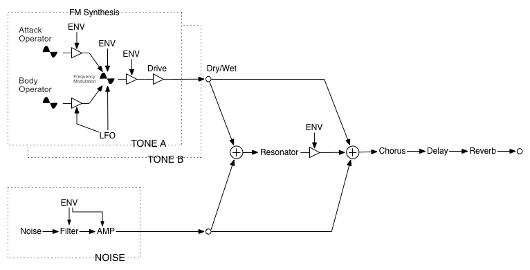 The two FM synth engines are optimized to reproduce the sound of bells. The "BODY" section is optimized to create the base sound, and the " ATTACK" section is optimized to create the sound at the moment of impact.