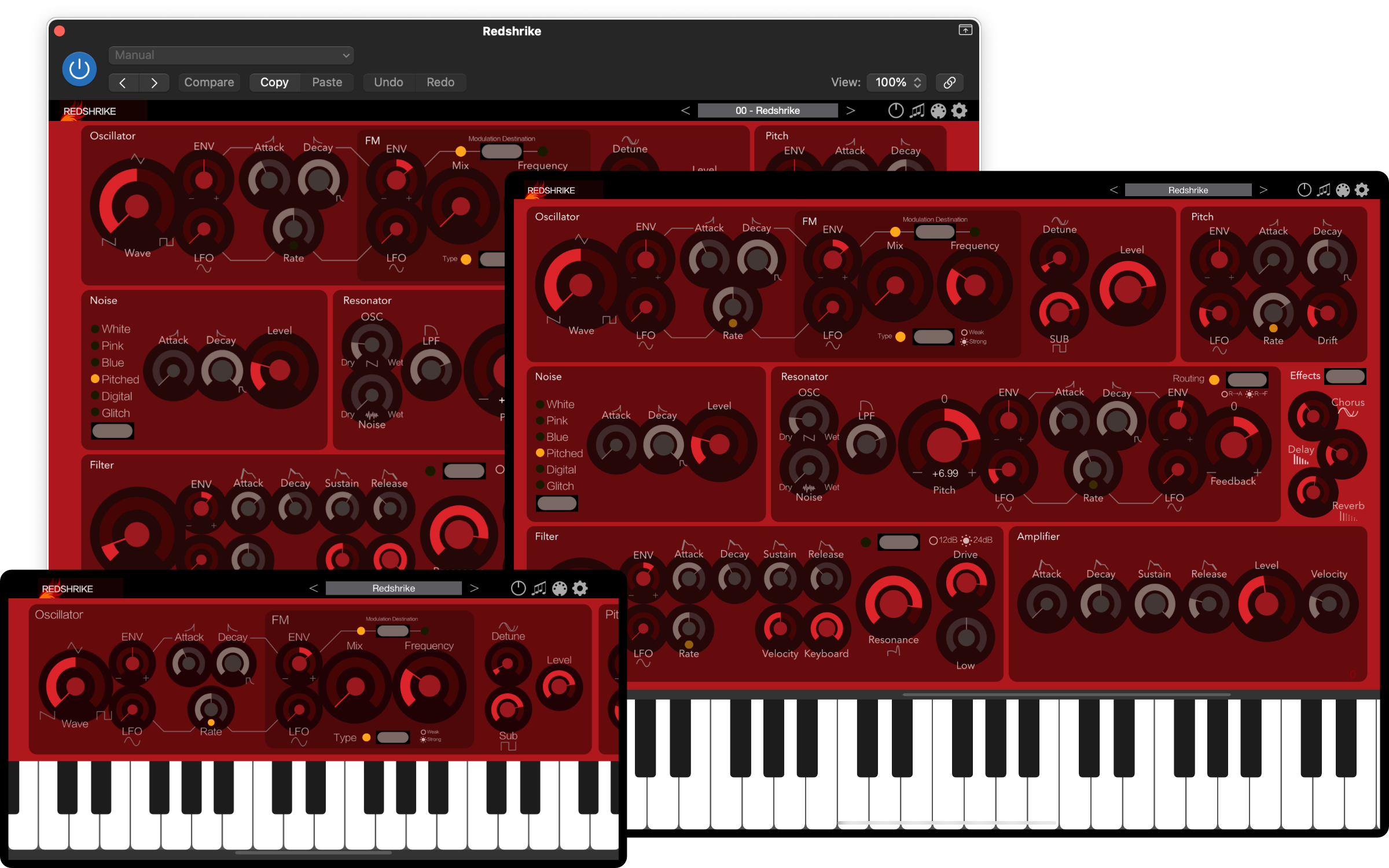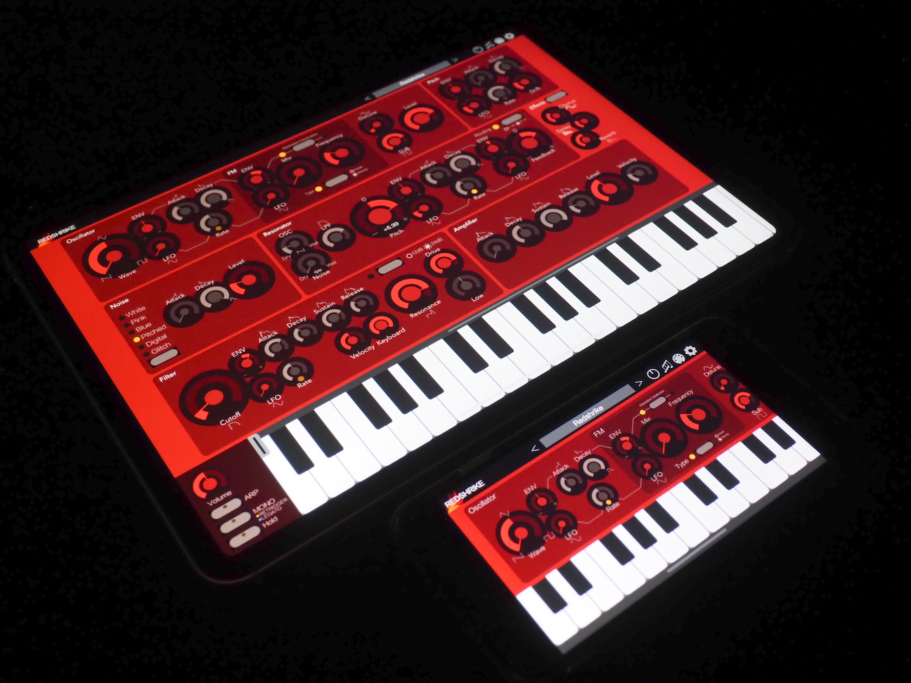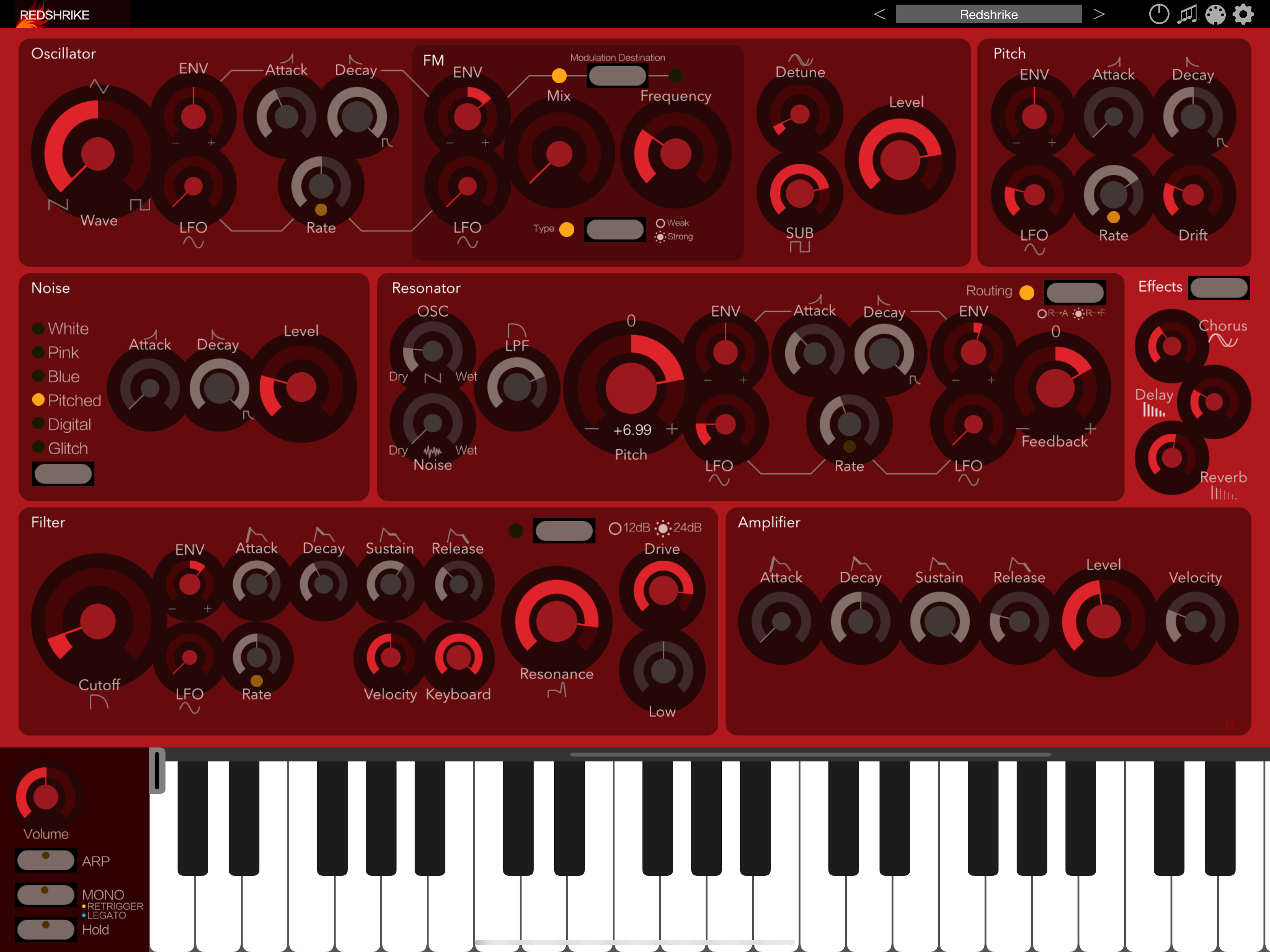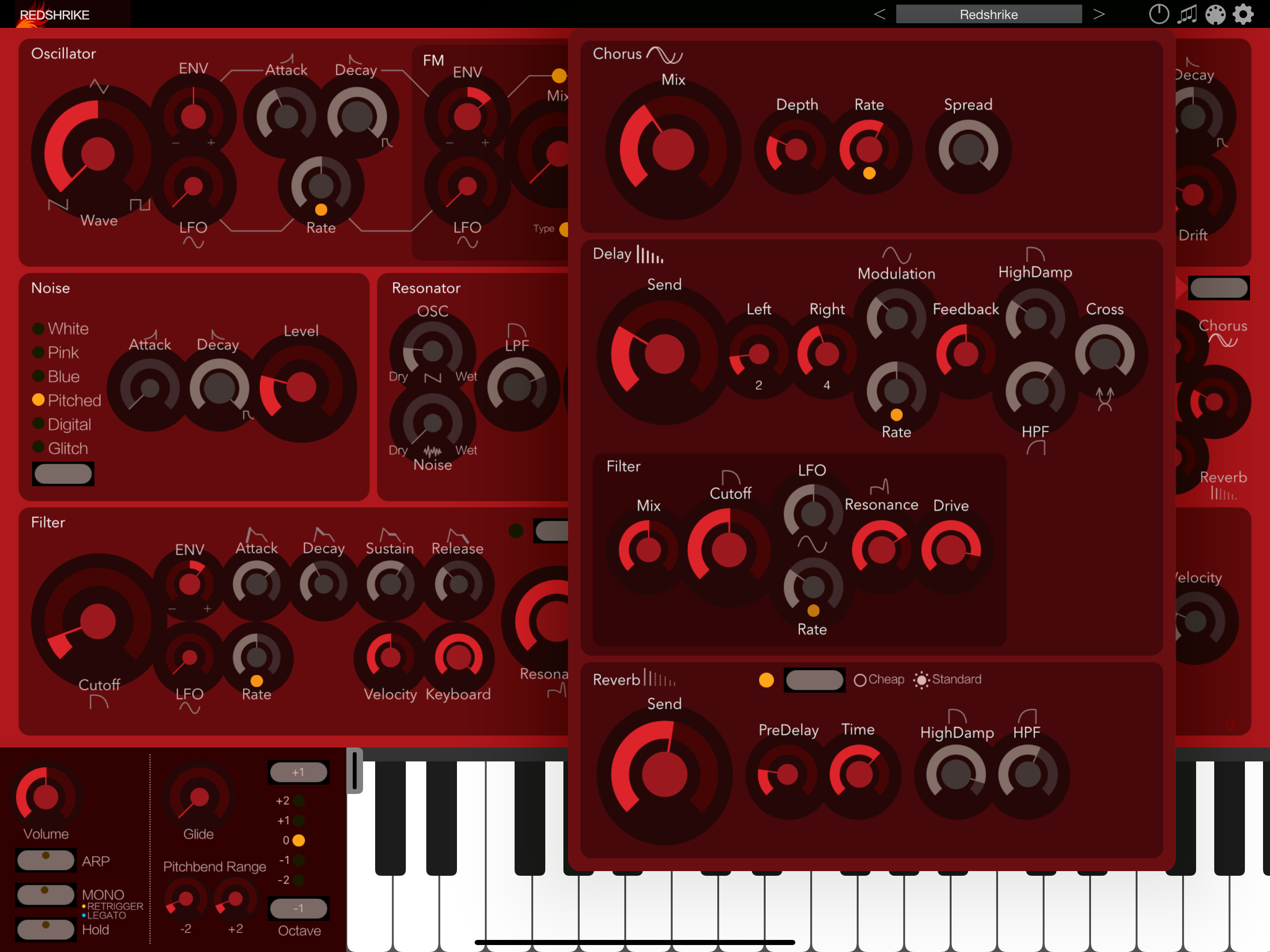 Redshrike is an AUv3-compatible synthesizer that combines a resonator designed for more complex sound creation and subtractive synthesis with an FM oscillator that creates distortion.