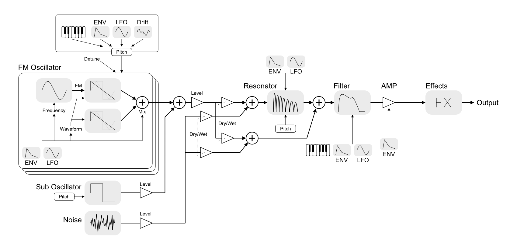 In the resonator, not only feedback amount, but also its pitch can be modulated with ENV and LFO.